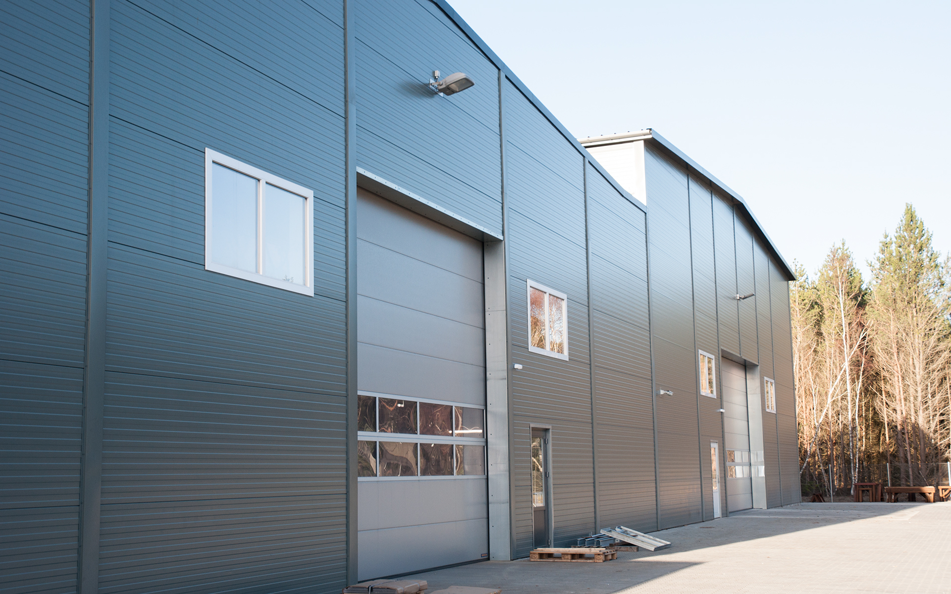 Facaden er beklædt med samme stålplader som resten af maskinfabrikkens haller, så den falder naturligt ind.